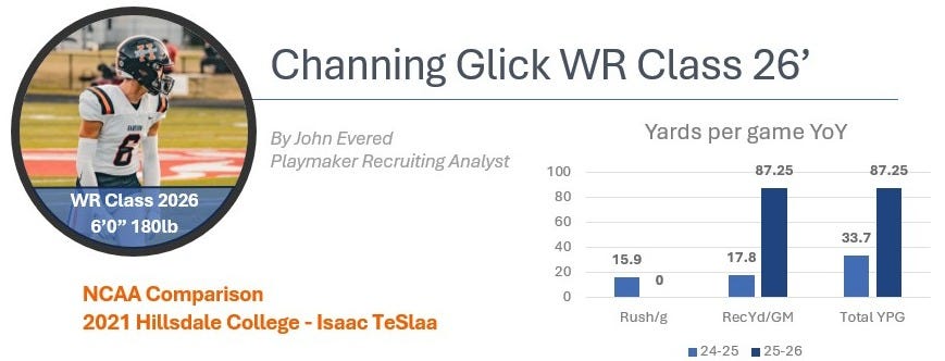 Channing Glick is a competitive player who is making up for lost time in his football journey. Originally a baseball player, Glick committed to playing football full time at the tail end of his sophomore year. He has the ability to work around press coverage and use his lateral speed to create separation. Glick has the ability to be physical, with many of his yards coming after contact and gains positioning using his prowess for field spacing. He’s able to make contact and doesn’t shy away from a safety and linebacker coming downfield in order to gain extra yards. He draws 3 or 4 defenders on plays through the middle of the field, requiring multiple players to make a tackle on a simple route. I like Channing Glick as a player and he’s under-recruited for his tape. I’ve watched much worse tape with many more offers across different collegiate levels and he deserves to hear about more available opportunities based on who he is as a player and the level of hunger he’s displayed in conversation with me. Glick recorded 120 yards on 6 catches to complement with a touchdown helping to defeat Plainfield High School, who are currently the 25th ranked team in Indiana and third in conference play.